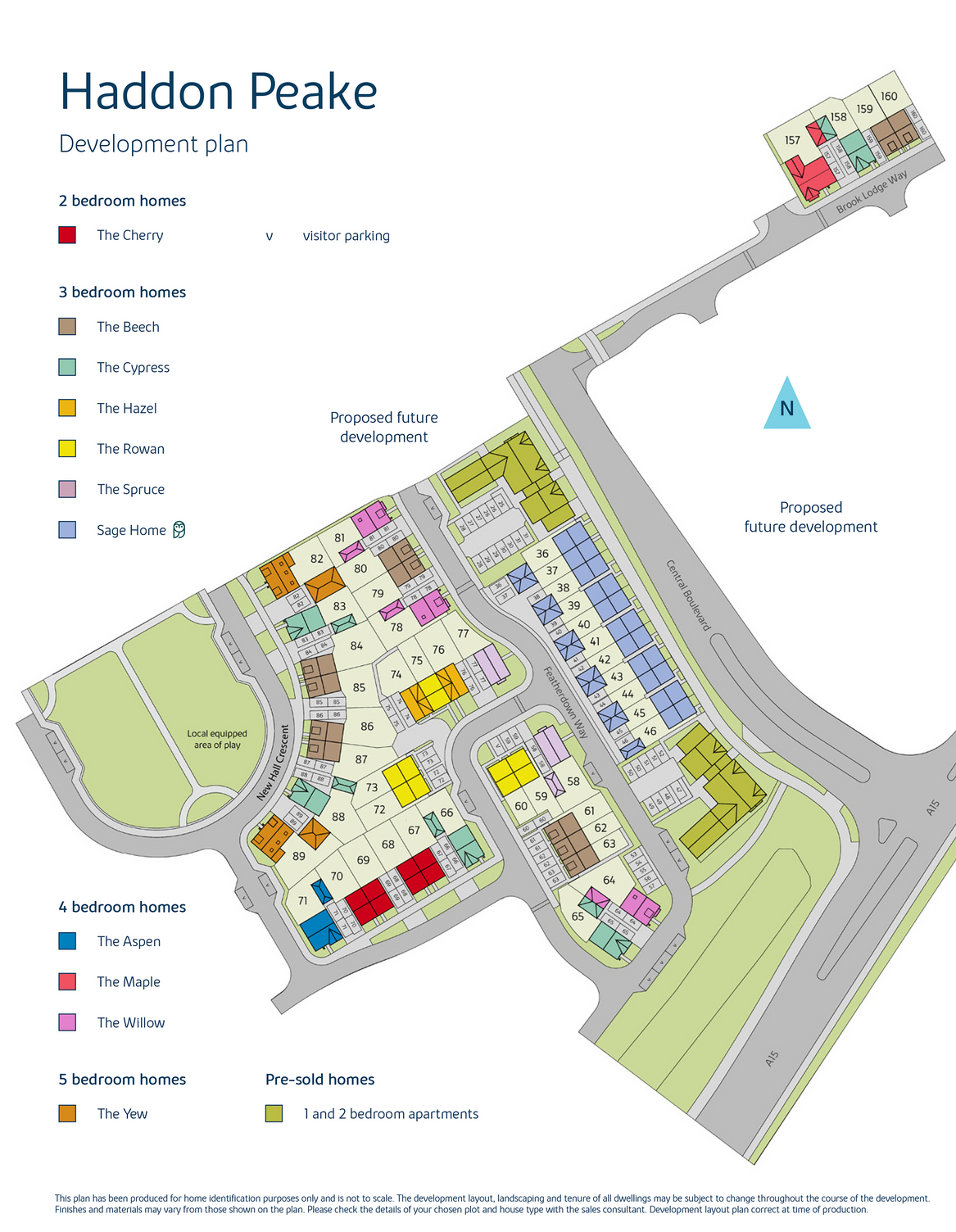 This plan has been produced for home identification purposes only and is not to scale. The development layout, landscaping and tenure of all dwellings may be subject to change throughout the course of the development. Finishes and materials may vary from those shown on the plan. Please check the details of your chosen plot and house type with the sales consultant. Development layout plan correct at time of production.