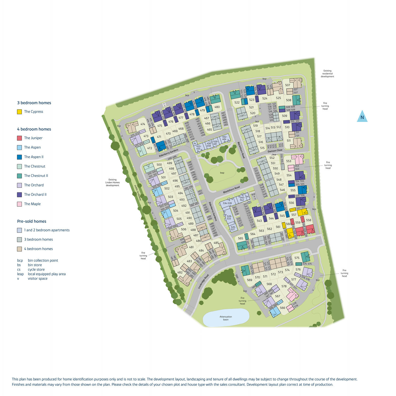 The site plan which can be found on this page, has been produced for home identification purposes only and is not to scale. The development layout, landscaping and tenure of all dwellings may be subject to change throughout the course of the development. Finishes and materials may vary from those shown on the plan. Please check the details of your chosen plot and house type with the sales consultant. Development layout plan correct at time of production.
