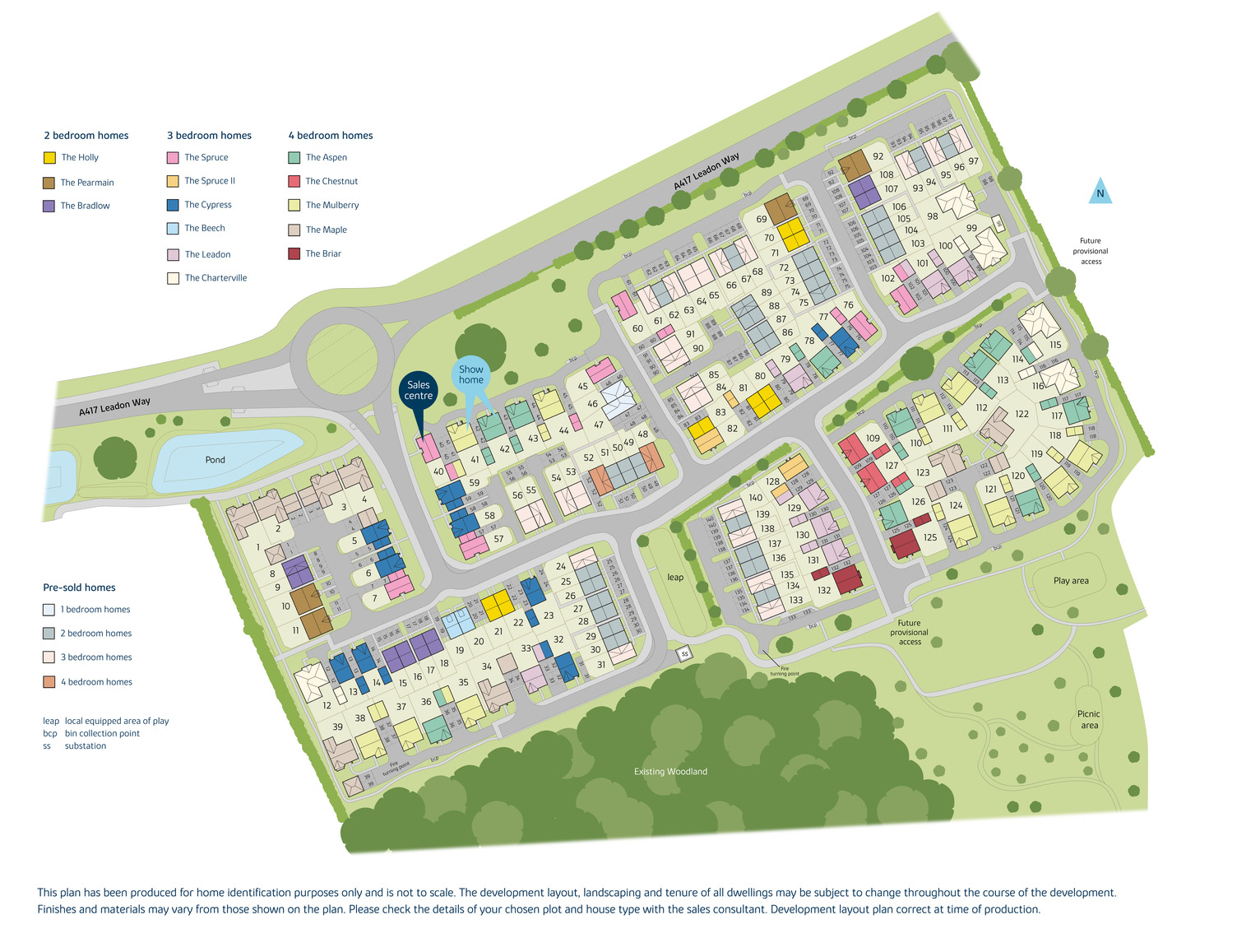 The site plan which can be found on this page, has been produced for home identification purposes only and is not to scale. The development layout, landscaping and tenure of all dwellings may be subject to change throughout the course of the development. Finishes and materials may vary from those shown on the plan. Please check the details of your chosen plot and house type with the sales consultant. Development layout plan correct at time of production.