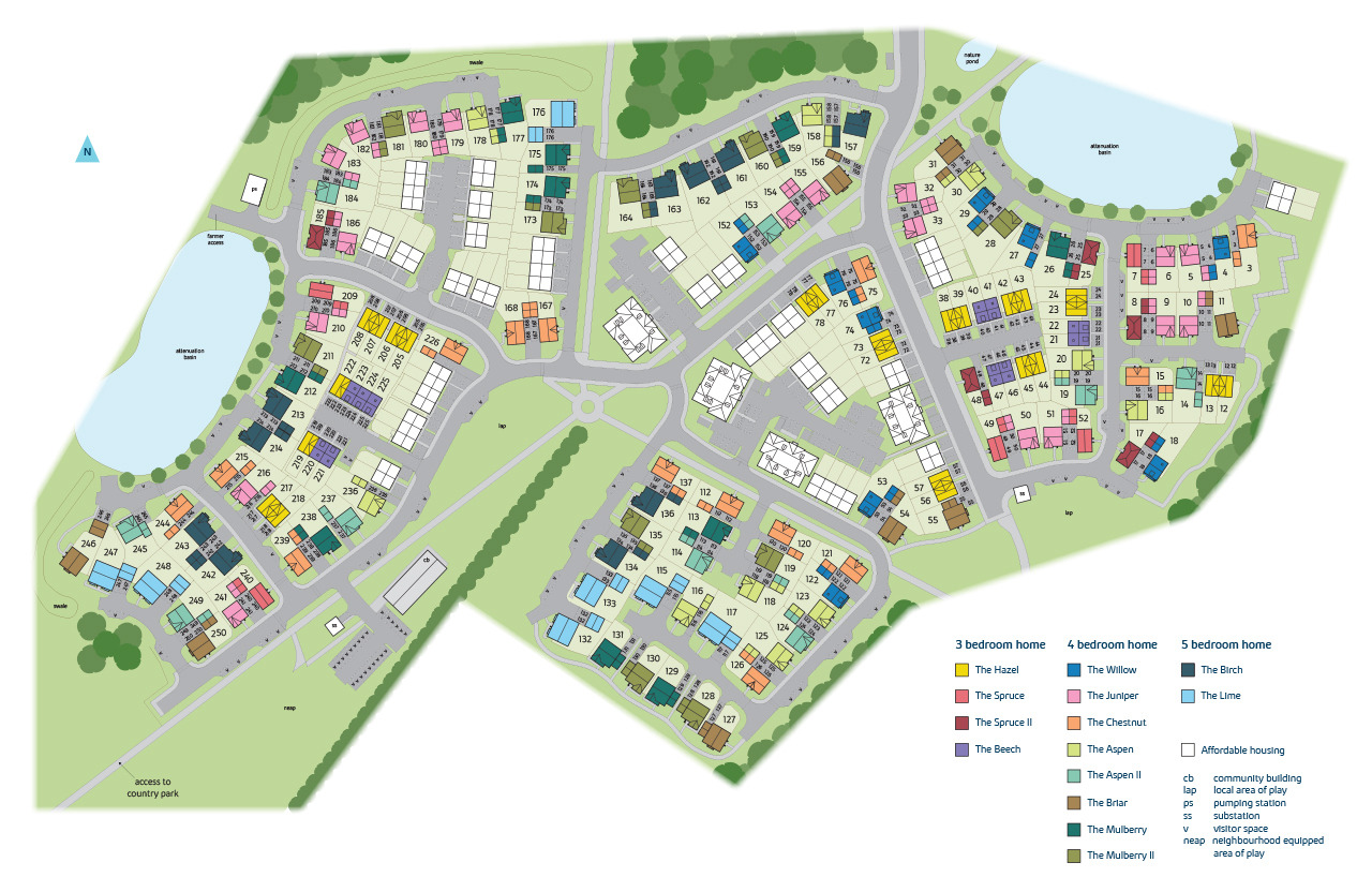 The site plan which can be found on this page, has been produced for home identification purposes only and is not to scale. The development layout, landscaping and tenure of all dwellings may be subject to change throughout the course of the development. Finishes and materials may vary from those shown on the plan. Please check the details of your chosen plot and house type with the sales consultant. Development layout plan correct at time of production.