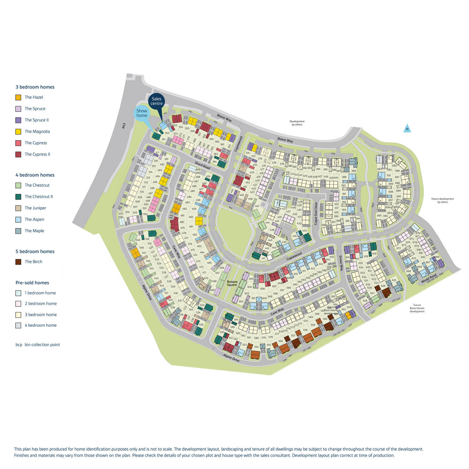 The site plan which can be found on this page, has been produced for home identification purposes only and is not to scale. The development layout, landscaping and tenure of all dwellings may be subject to change throughout the course of the development. Finishes and materials may vary from those shown on the plan. Please check the details of your chosen plot and house type with the sales consultant. Development layout plan correct at time of production.
