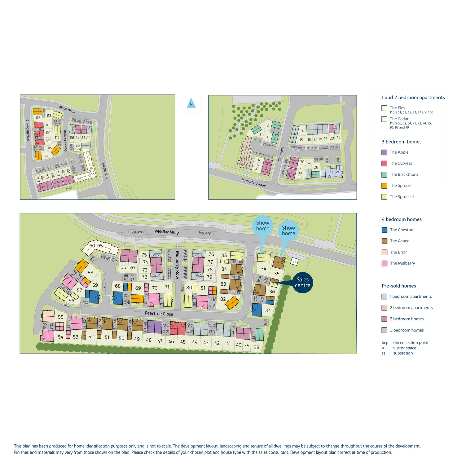 The site plan which can be found on this page, has been produced for home identification purposes only and is not to scale. The development layout, landscaping and tenure of all dwellings may be subject to change throughout the course of the development and is for illustration only. Finishes and materials may vary from those shown on the plan. Please check the details of your chosen plot and house type with the sales consultant. Development layout plan correct at time of production.