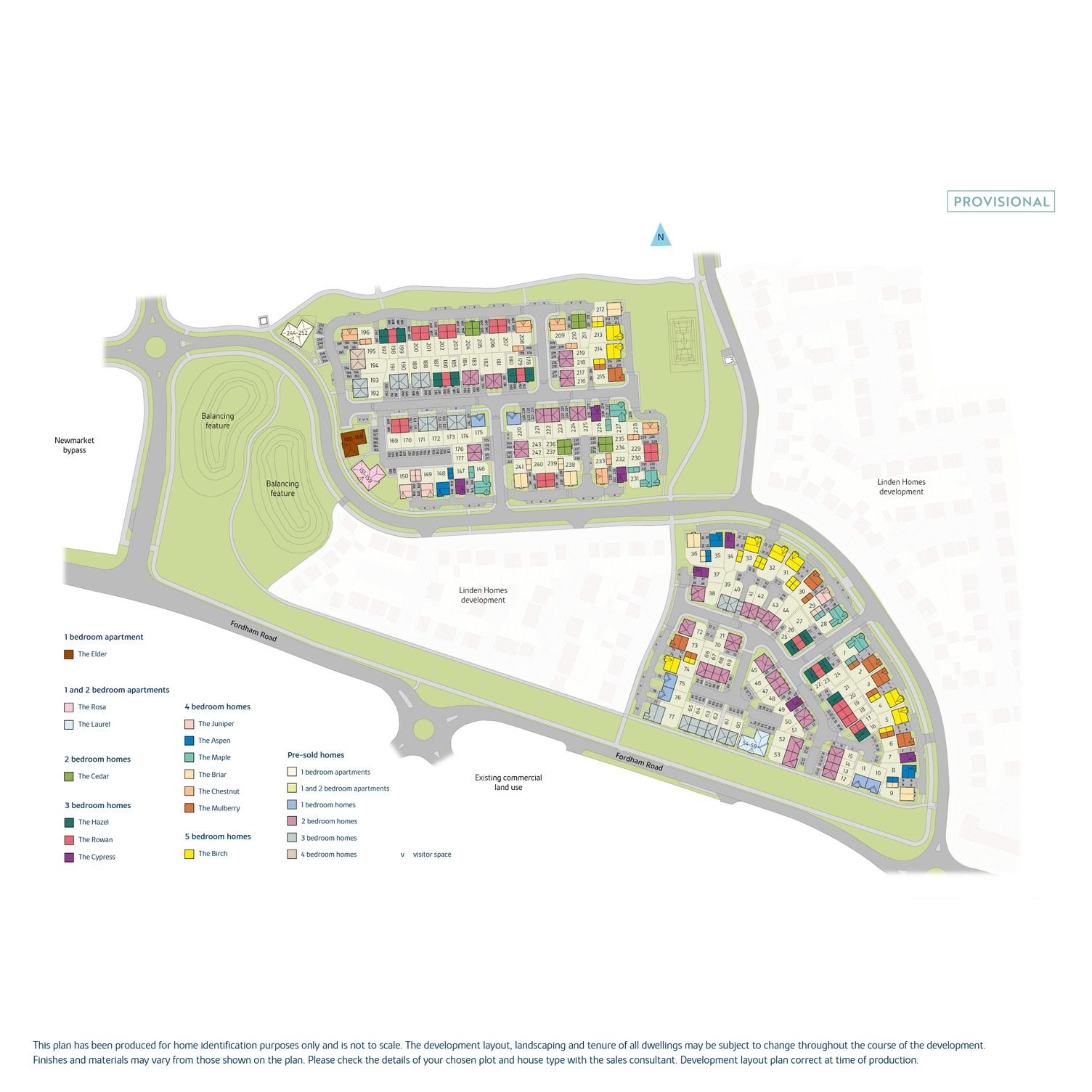 The site plan which can be found on this page, has been produced for home identification purposes only and is not to scale. The development layout, landscaping and tenure of all dwellings may be subject to change throughout the course of the development. Finishes and materials may vary from those shown on the plan. Please check the details of your chosen plot and house type with the sales consultant. Development layout plan correct at time of production.