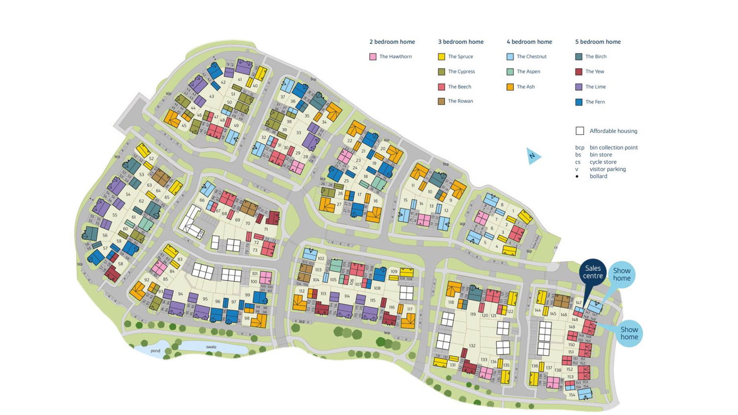 The site plan which can be found on this page, has been produced for home identification purposes only and is not to scale. The development layout, landscaping and tenure of all dwellings may be subject to change throughout the course of the development. Finishes and materials may vary from those shown on the plan. Please check the details of your chosen plot and house type with the sales consultant. Development layout plan correct at time of production.