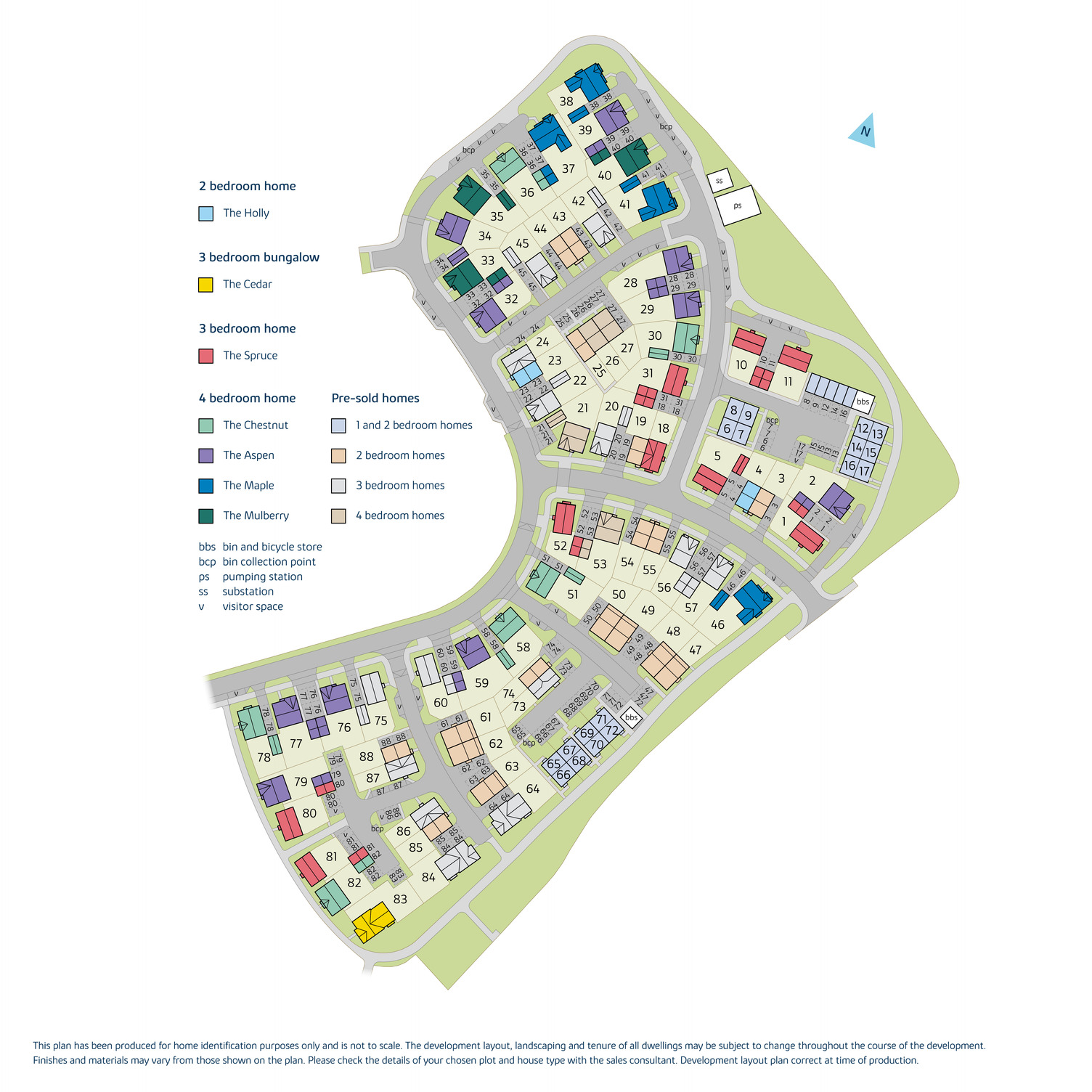 The site plan which can be found on this page, has been produced for home identification purposes only and is not to scale. The development layout, landscaping and tenure of all dwellings may be subject to change throughout the course of the development. Finishes and materials may vary from those shown on the plan. Please check the details of your chosen plot and house type with the sales consultant. Development layout plan correct at time of production.