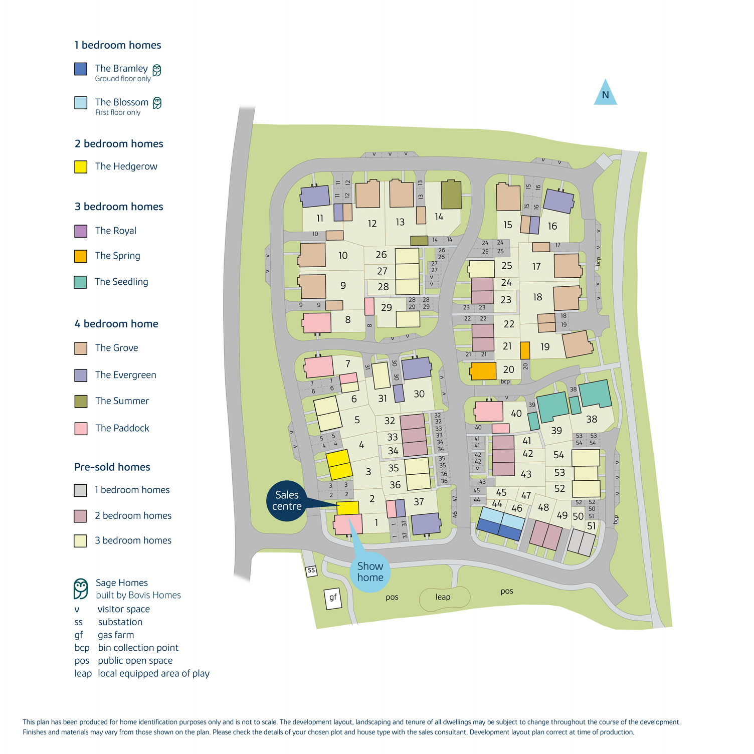 The site plan which can be found on this page, has been produced for home identification purposes only and is not to scale. The development layout, landscaping and tenure of all dwellings may be subject to change throughout the course of the development. Finishes and materials may vary from those shown on the plan. Please check the details of your chosen plot and house type with the sales consultant. Development layout plan correct at time of production.